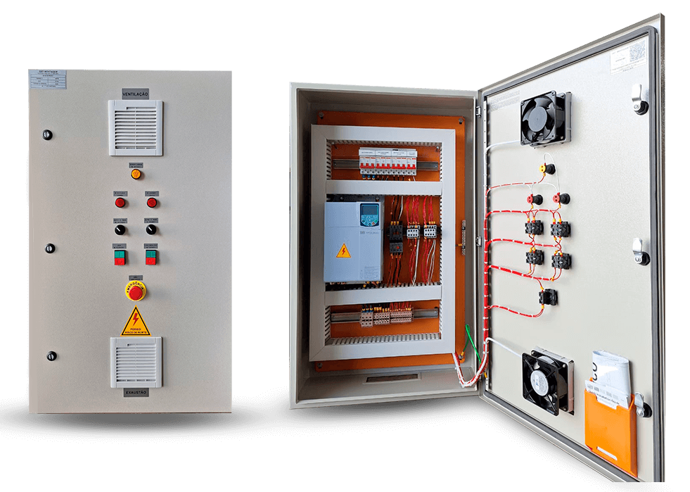 Esta linha de quadros atende à norma NBR 16881 para variação, sentido e conrtole de velocidade de motores trifásicos. Através de inversosr de frequencia com entreadas e saídas digitais e analógicas, controle por IHM (Interface Homem Máquina). Automação industrial.